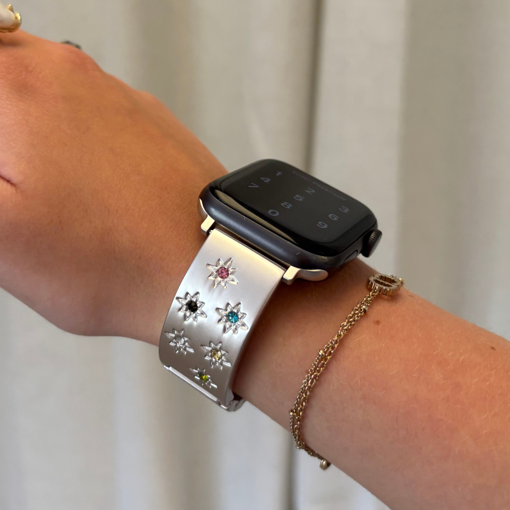 Bring some dreamy, sun-kissed sparkle to your wrist with our Ibiza Coloured Stone Apple Watch Strap in Starlight. Designed for the girls who love their accessories sweet, stylish, and just a little bit magical, this strap is dotted with delicate coloured stones that shimmer like a summer sunset on the beach. 💫🌸