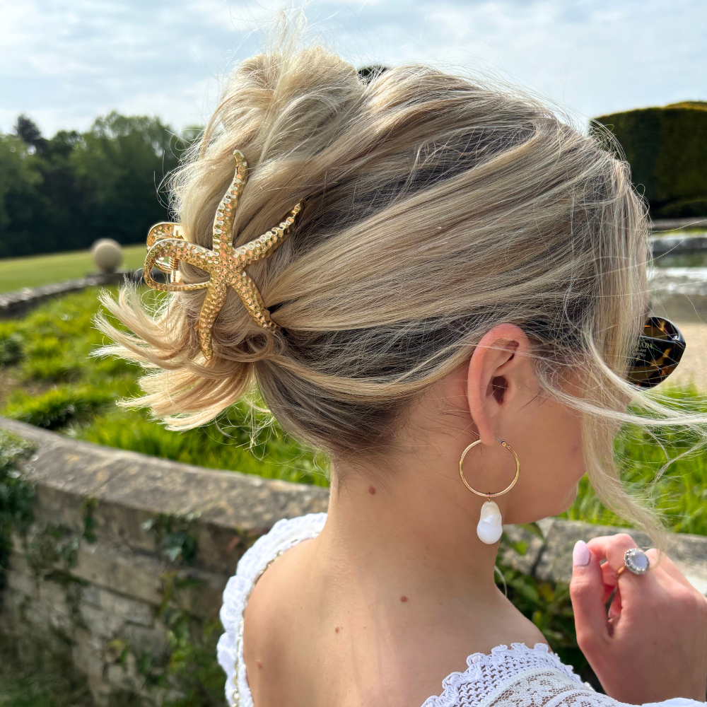 Infuse your hairstyle with vibrant, island-inspired beauty with our Gold Starfish Claw Clip. This stunning hair accessory combines bold design with everyday practicality, perfect for adding a touch of exotic flair to your look.