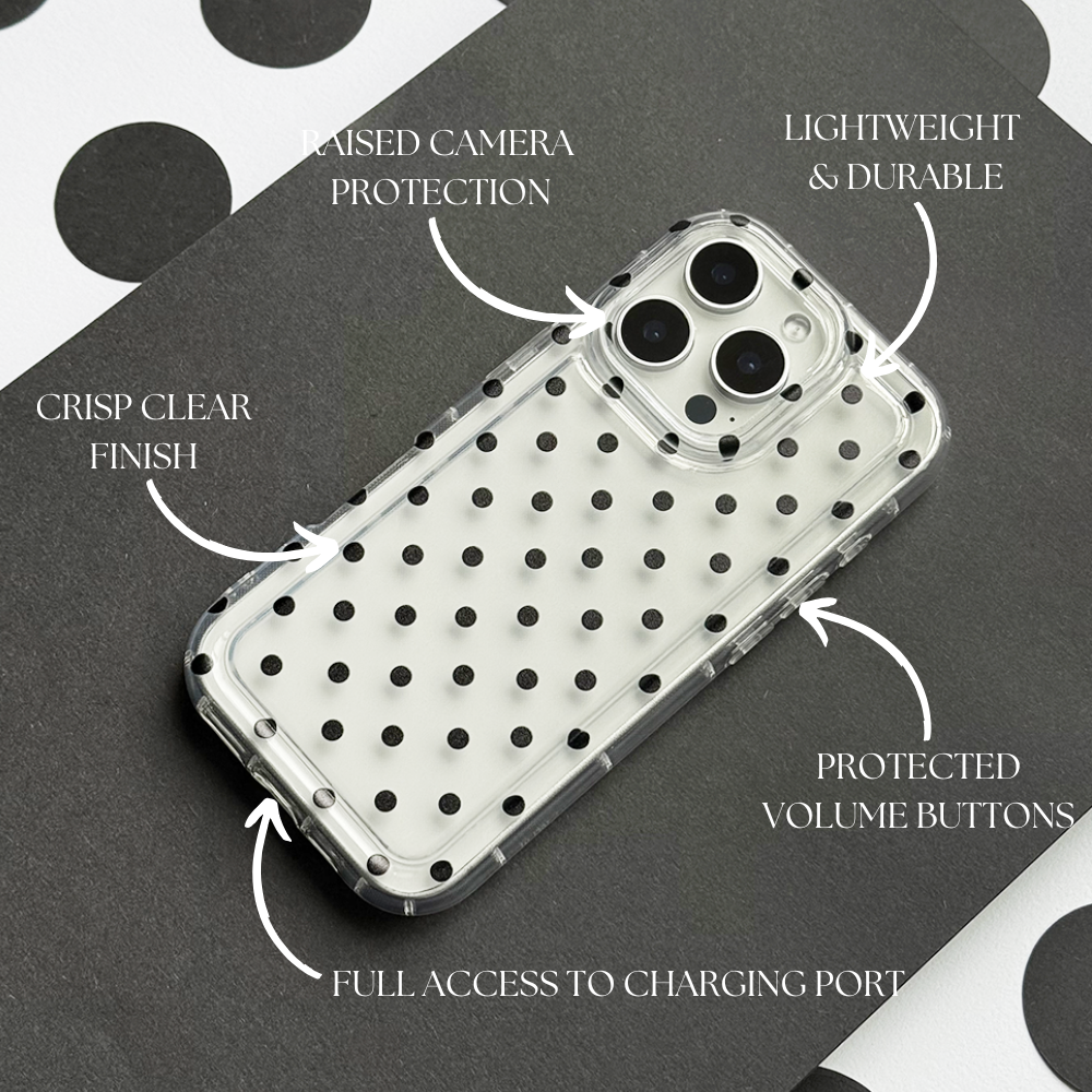 Our Clear Phone Case – Black Polka Dot is a classic with a playful twist, featuring dainty inky dots scattered over a crystal-clear base so your phone’s natural beauty still shines through. She’s lightweight, protective, and oh-so-versatile – the kind of case that goes with everything in your wardrobe.