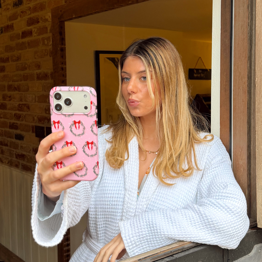 Get your phone holiday-ready with the Christmas Wreaths Tough Phone Case — the sweetest way to bring festive cheer everywhere you go! This charming pink case features a repeating pattern of classic Christmas wreaths adorned with red bows, scattered with soft snowflakes for that perfect cozy-season feel.