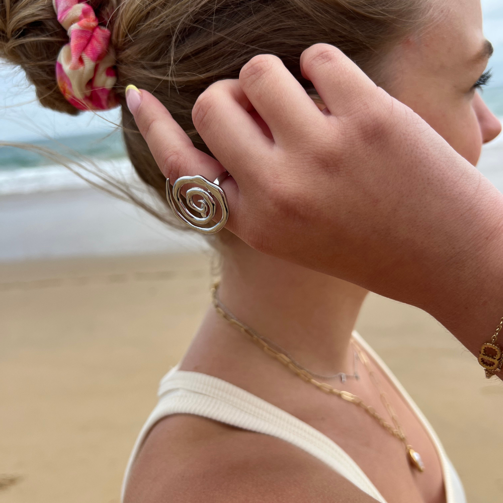 Get ready to elevate your summer look with our Sunset Spiral Ring. It's the perfect accessory for any cool girl looking to add a touch of beachy vibes to her style. Embrace the season with this must-have piece, available in silver or gold.