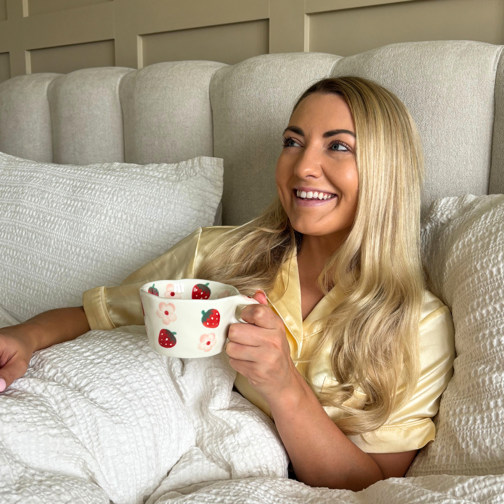Adorned with hand-painted-style strawberries and delicate blooms, inside and out, this white ceramic cutie turns every sip into a garden tea party. It’s like a little burst of springtime with every pour, perfect for cosy mornings and dreamy afternoons.