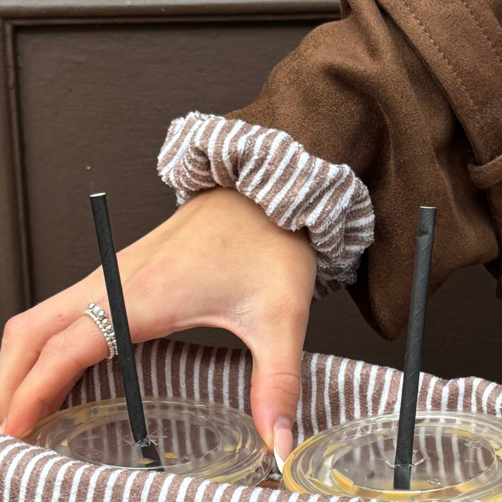 Soft, practical, and stylish – the Towel Scrunchie in Chestnut Stripes is the perfect everyday accessory.